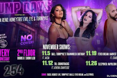 Tassel Request Live, Turnpyke’s Balls, Fever Dream and Sleepover- join us each Wednesday at 254 for a FREE, uniquely themed burlesque show! Each Wedneday join us for a night of drinks, food, and live entertainment in the heart of the gayborhood! Produced by Victoria Reno, Turnpyke and HoneyTree EvilEye, featuring an astounding rotation of featured…