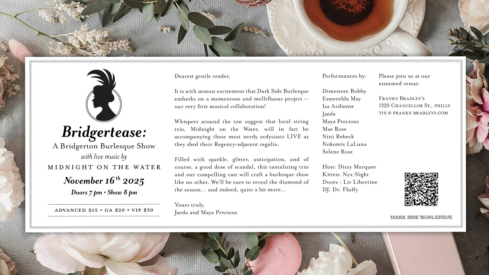 Dark Side Burlesque presents Bridgertease: A Bridgerton Burlesque Show with live music by Midnight on the Water