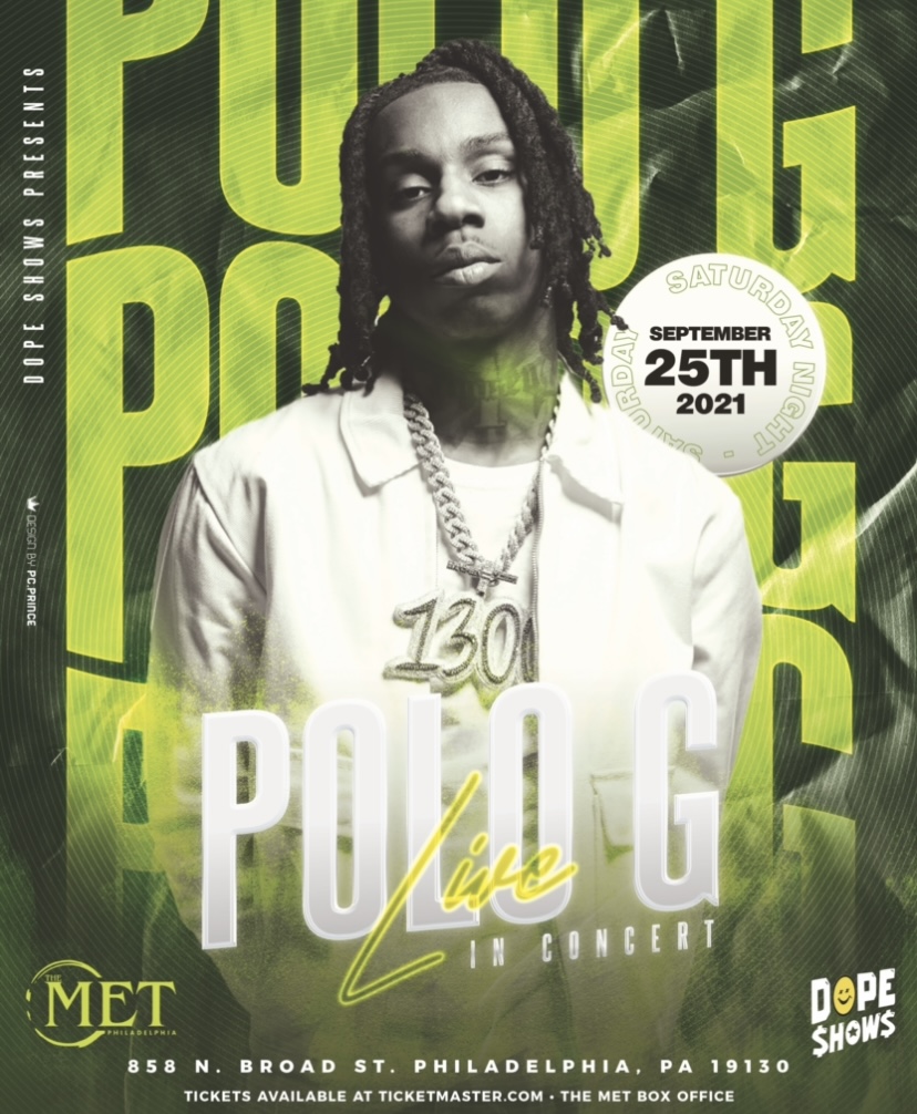 - On Saturday, September 25, 2021, Dope Shows presents a live concert at The Met Philadelphia with headliner Polo G. Attendees of this upcoming celebration of arts and urban culture can expect a show-stopping hip-hop performance from gay rapper Polo G, independent brand vendors, and sponsorship activations.