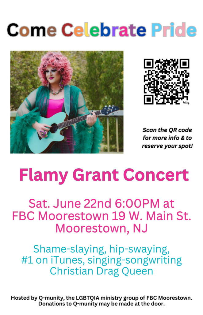 ALL are welcome to celebrate PRIDE at First Baptist Church of Moorestown, NJ on Saturday, June 22 at 6:00 PM for a very special Flamy Grant Pride Concert. Flamy is a shame-slaying, hip-swaying, Billboard-Topping, #1 on iTunes, singing-songwriting Christian Drag queen. Her music centers on the Queer spiritual journey, telling stories of resilience and recovery from religious trauma where LGBTQIA+ people are frequently ignored by, harmed in, or ejected from religious spaces. This down-to-earth Diva has a bold lip, a big lash, and a blistering voice that will make for a moving, joyous, highly entertaining evening of FUN, PRIDE, and MUSIC! To register for tickets or get more info, click here bit.ly/43rZy33 , scan the QR Code on the Flyer, or email FBCMQmunity@gmail.com. The concert is sponsored by Q-munity, the LGBTQIA+ Ministry Circle of FBC Moorestown. Donations to Q-munity may be made at the event door.