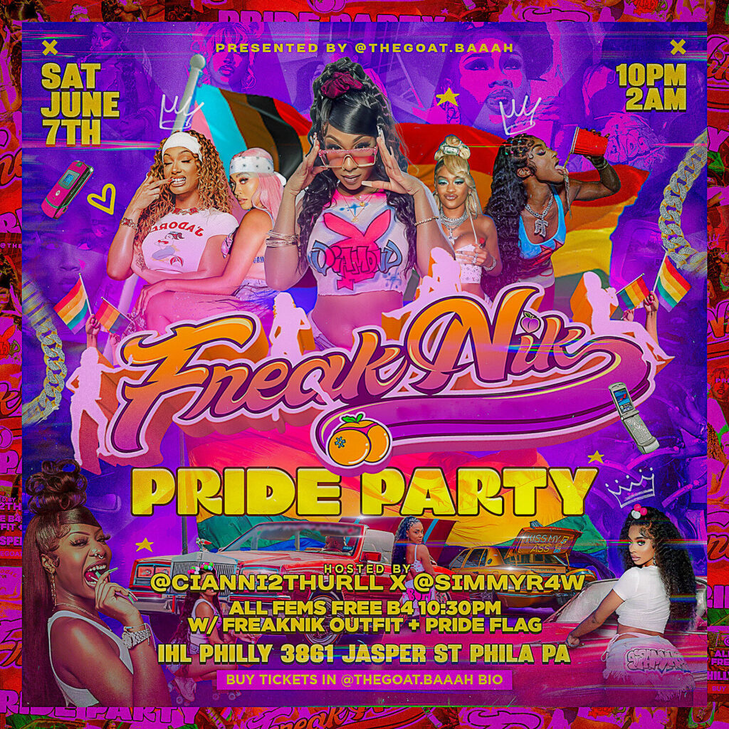 Get ready for the wildest, sexiest Pride bash in Philly! The FreakNik Pride Party is serving 90s ATL vibes meets rainbow realness — hosted by @Cianni2Thurll and @SimmyR4W. Come dressed in your freakiest FreakNik outfit and rep that pride flag loud and proud. Dance, drink, and celebrate at IHL Philly with a crowd that knows how to turn up. All fems get in FREE before 10:30 PM if they show up in theme.