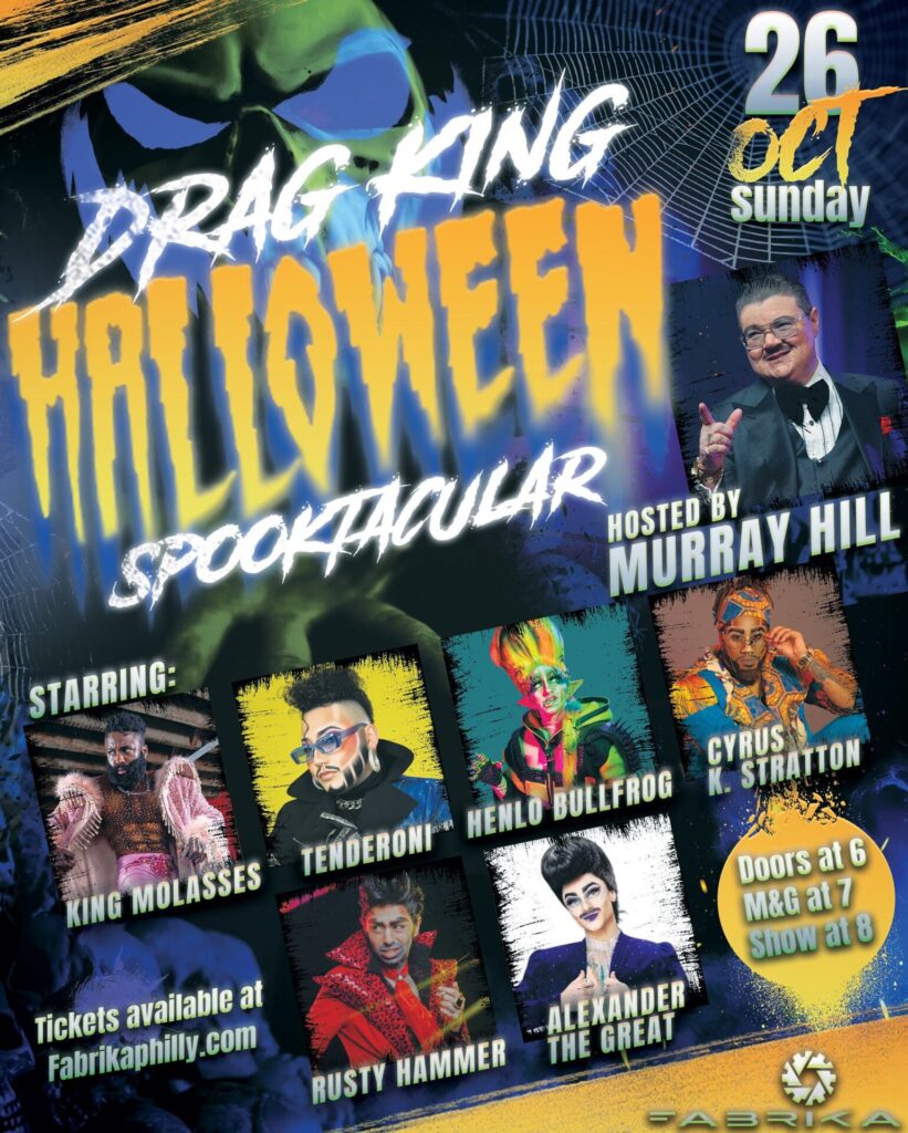 Get ready for a night of fright, swagger, and show-stopping drag king magic! Starring King Molasses, Tenderoni, Henlo Bull Frog, Rusty Hammer, Cyrus K. Stratton, and Alexander the Great, this Halloween showcase brings you bone-rattling performances, spooky glamour, and electrifying energy that will haunt you in the best way. One stage, six kings, endless thrills… the ultimate Halloween drag spectacle! Two Drink Mimimum Applies. Meet and Greet Tickets Available!