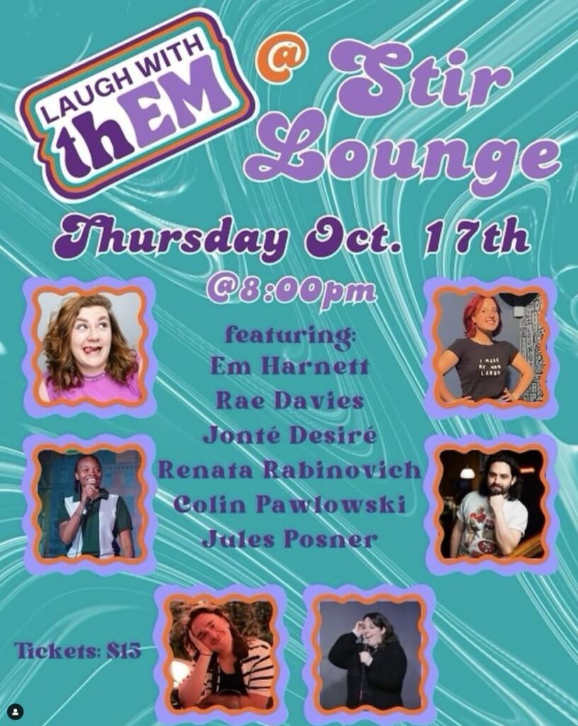 Laugh with thEM” is a comedy showcase featuring LGBTQ+ comedians, offering a night of laughter and entertainment. The event highlights diverse voices and celebrates inclusivity in comedy. The lineup includes Em Harnett, Rae Davies, Jonté Desiré, Renata Rabinovich, Colin Pawlowski, and Jules Posner. This event reflects a strong LGBT theme by spotlighting performers from the community