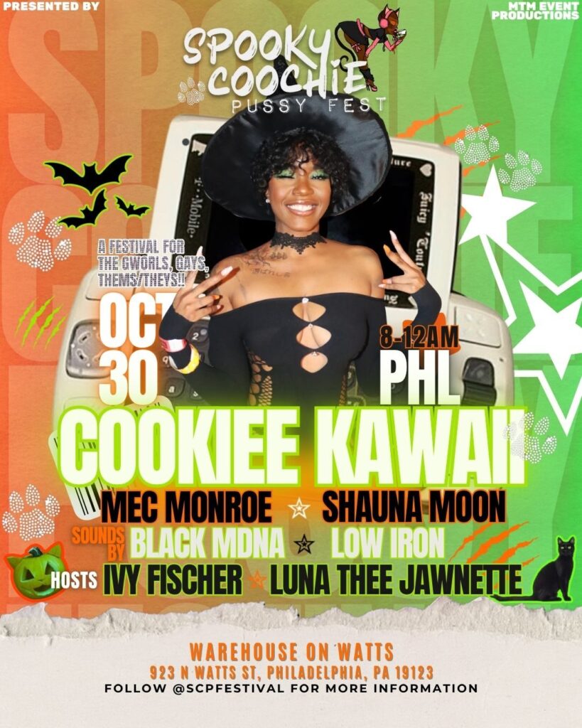 Headlined by the Jersey Club Queen Cookiee Kawaii with performances by Mec Monroe & Shauna Moon. Sounds by DJ Low Iron & BLACK MDNA. Hosted by Philly’s own Luna Thee Jawnette and Ivy Fischer.