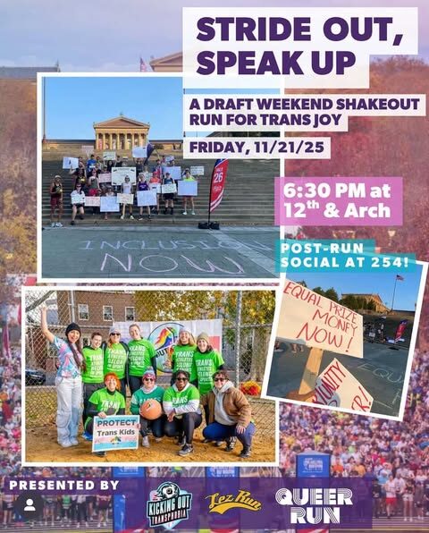 Join us Friday, November 21 at 6:30 PM at the PA Convention Center (12th & Arch) for Stride Out, Speak Up: A Kicking Out Transphobia × Lez Run × Queer Run collaboration.