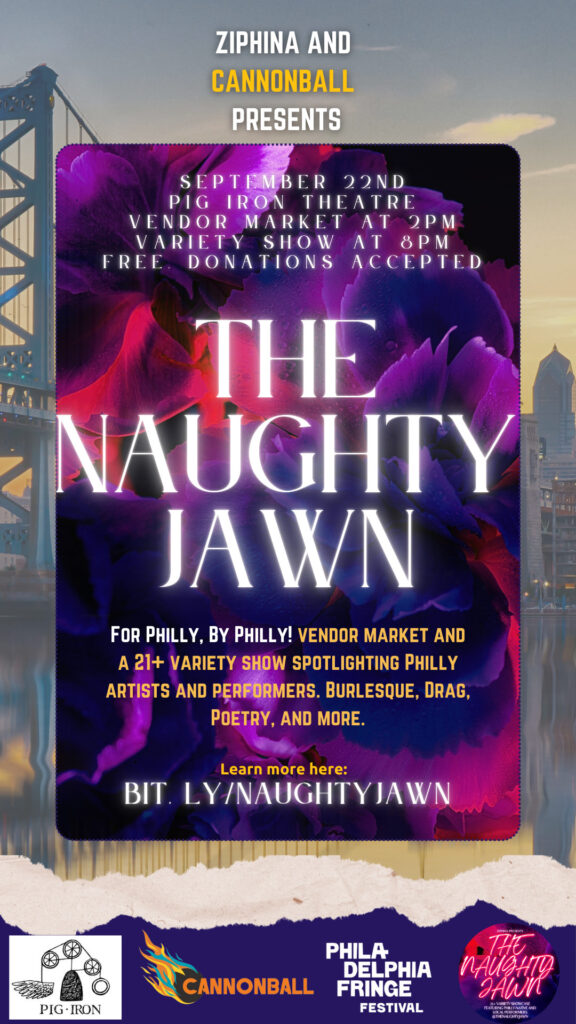 For Philly, by Philly! The Naughty Jawn is a 21+ variety showcase and community event where Philly-native and local performers come to express themselves. Focusing on the performing arts, including burlesque, drag, poetry, singing, flow arts, etc. Immerse yourself with Philly culture, body positivity, and supporting fellow creatives at the Pig Iron Theatre. These events are free, donations accepted at the door! This day of events are partnered with Cannonball OVERBOARD! and the Fringe Festival: